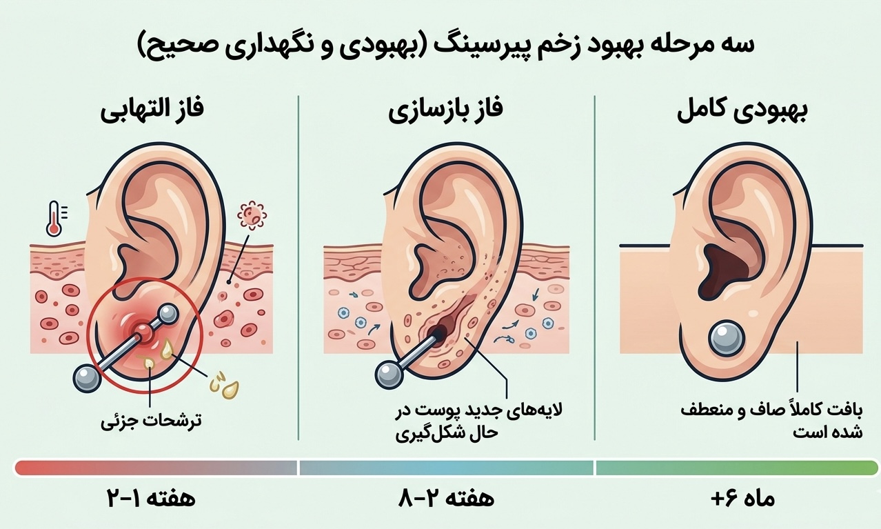 • هشدار: این مرحله «تله» است! چون از بیرون همه چیز خوب به نظر میرسد، بسیاری از افراد مراقبت را قطع میکنند یا به فکر تعویض پیرسینگ میافتند؛ در حالی که لایه داخلی هنوز بسیار نازک و آسیبپذیر است.